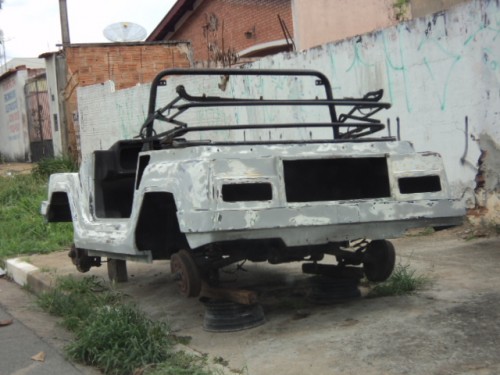 O carro teve sua pintura toda removida e a superfície preparada para repintura, o que nos leva a concluir que estaria em reforma. Mas o que intriga é porquê ele está na rua, ao invés de uma garagem ou oficina? O carro está sem rodas, que podem ter sido removidas para evitar ser roubado?!?!