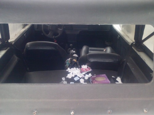 Como podemos ver, o estado do coitado piorou bastante. Manchas na pintura (especialmente na dianteira), vigia traseiro rasgado completamente e conta até com entulho dentro; que gente porca, pra quê?