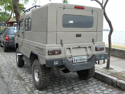 Pára-brisas maiores, teto mais alto (e com janelinha de Land Rover Defender), rack de teto, fárois de milha auxiliares, um pára-choques traseiro de ferro e essa belíssima capota de baú, que o deixa com cara de furgão.