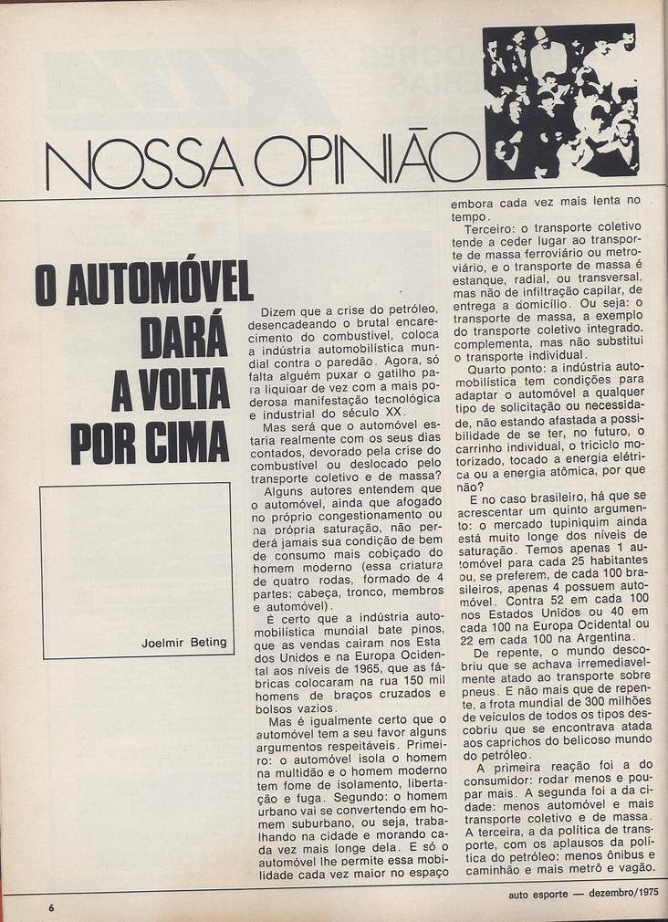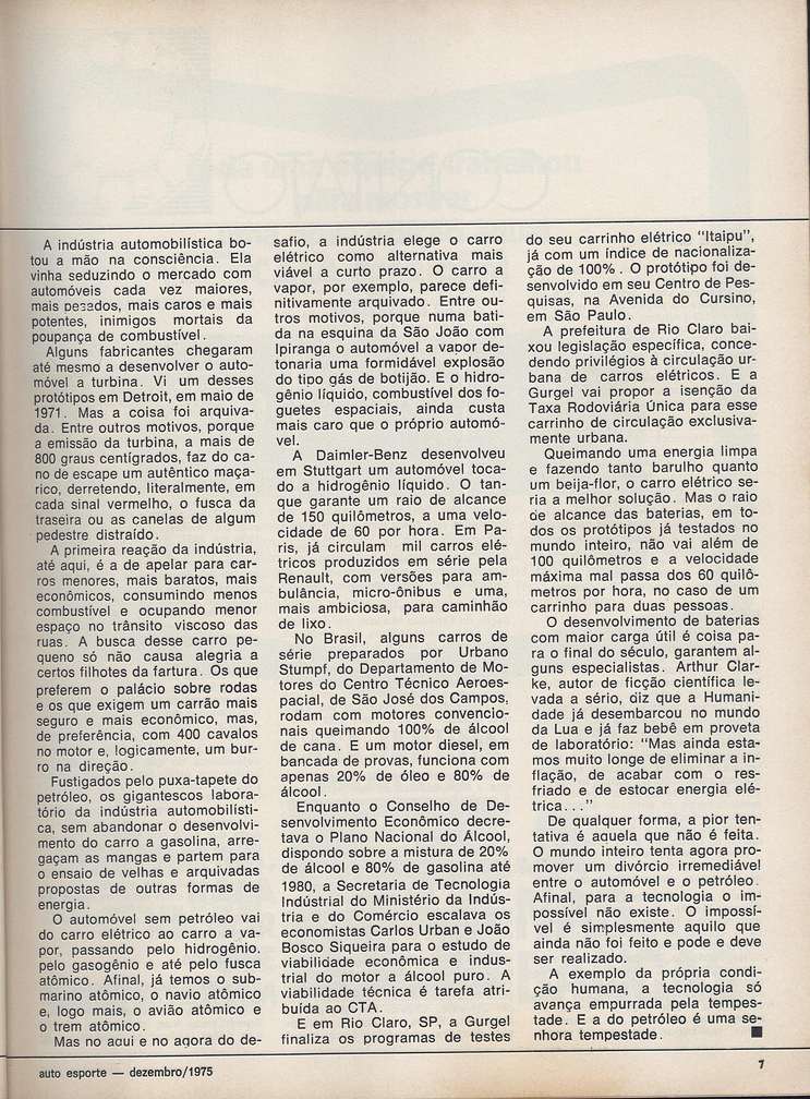 Comentários: Artigo sobre o futuro dos automóveis, mencionando o protótipo Itaipú e a intenção da cidade de Rio Claro de fazer uma legislação incentivando o carro elétrico.