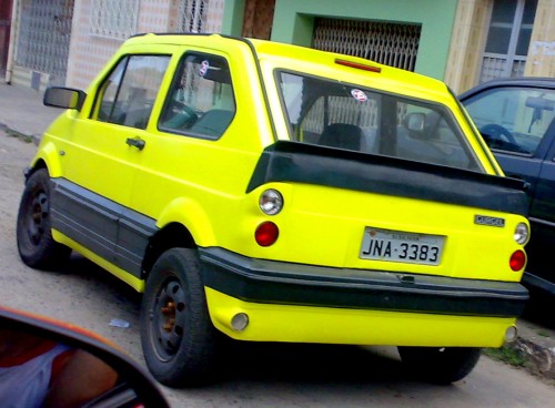 Segundo o Marcio, o carro é de uma senhora, cujo filho modificou o carrinho para o uso dela: faróis de Uno, lanternas de L-200, vidros elétricos e uma cor pra lá de chamativa foram as alterações, mas há um “pára-choques” sob o próprio pára-choques dianteiro original… gostaram?