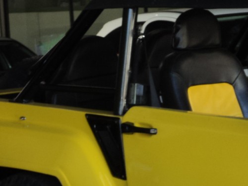 Notem a falta do suporte lateral do quadro do pára-brisas e a porta, que no TL era mais baixa, batia no mesmo nível que atrás, não tinha esse desnível grosseiro. O sant’antonio também é adaptado e para terminar, o carro foi pintado nessa belíssima cor com os aros do farol em preto, para combinar com a entrada de ar latgeral e pára-choques… Mas que besteira! (na minha opinião.)