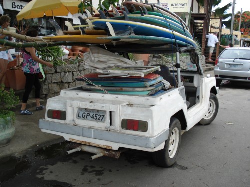 Carro bem estragado mais rodando. Contei 14 pranchas de Surf em cima dele, fora as pranchas de Bodyboard e as varas de bambu amarradas no parachoques. Lembrou o X-12 carregado! que flagrei em Búzios, mas ganhou longe!