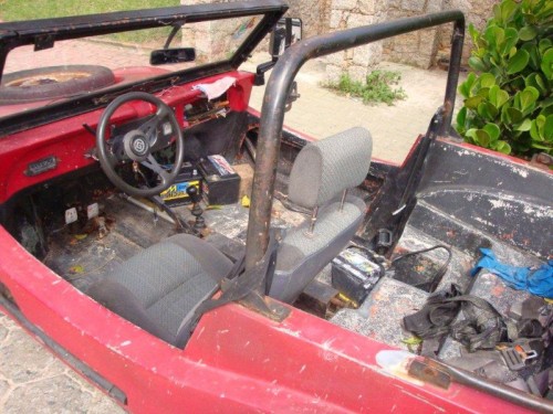 O carro está bem cansado, como era de se esperar por ser utilizado diariamente em condições severas, o motor e a estrutura devem estar condenados… Está sem as portas, está com rodas de VW 1500 (4 furos, acho que é isso) – quais eram as rodas originais? Incrivelmente conta com volante Gurgel original, mas acredito ser dos últimos X-12, e com a pá na lateral!